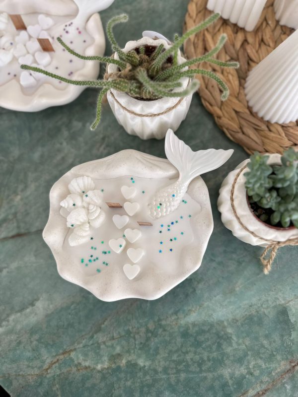 “Ocean of Love”, el yapımı doğal soya wax ile hazırlanmış, denizkızı temalı eşsiz bir dekoratif mumdur. Kalp formundaki minik detaylar, ahşap fitil dokunuşu ve ışıltılı süslemelerle hem romantik hem eğlenceli.