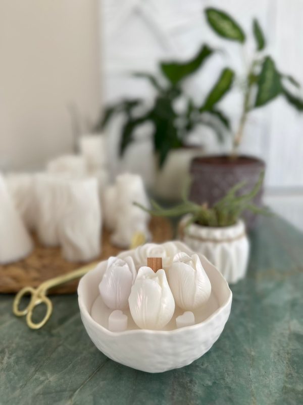 Saflık, zarafet ve huzurun bir araya geldiği bu özel tasarım mum, beyaz gül ve lalelerle şekillendirildi.